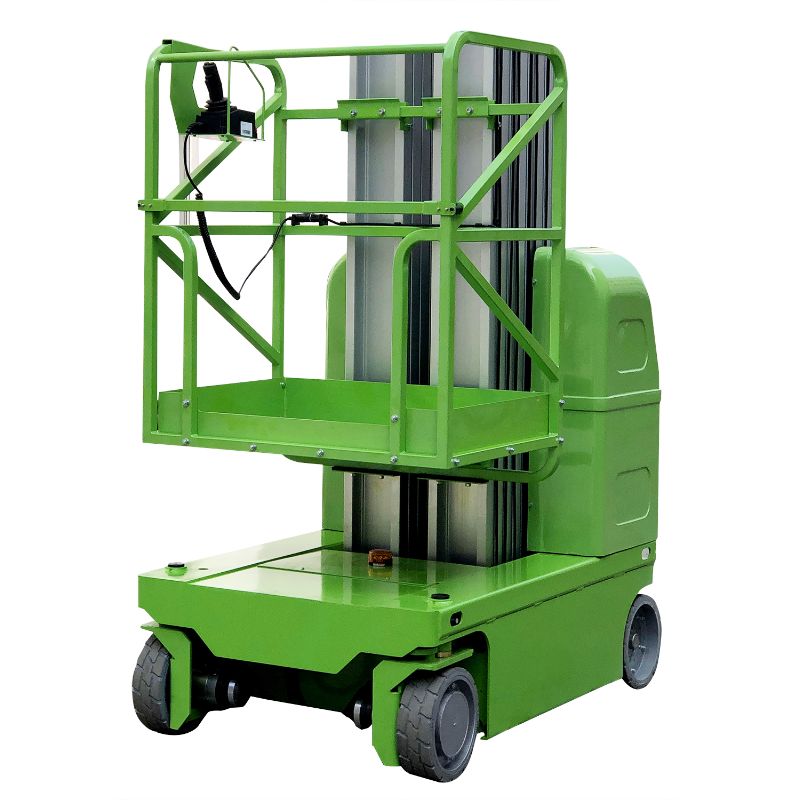 Green 9m Double Mast Self Propelled Vertical Lift With Hydraulic Turning Wheel