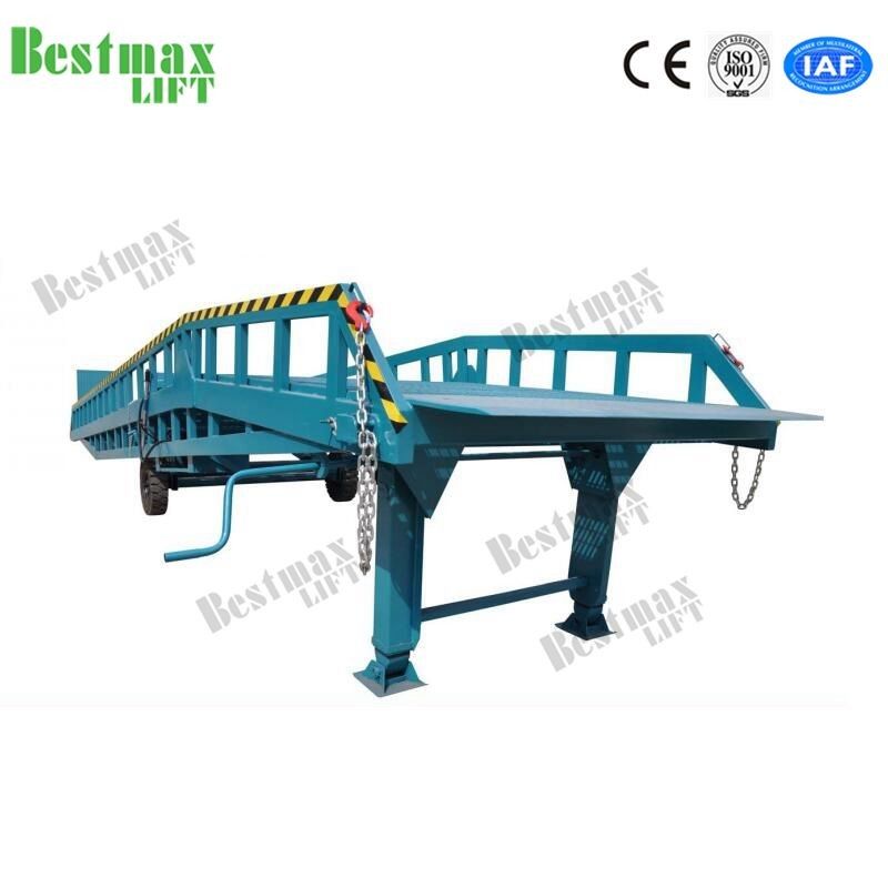 Mobile Dock Ramp is an auxiliary machine for loading and unloading cargo with forklift coordination use. The forklift can drive from the ground to the truck compartment to work directly through the Mobile Dock Ramp. There is no need to connect to power supply, for it uses manual hydraulic power. Only one man needed to manipulate the machine to load and unload goods safely and fast. And there is safety locking chain in the dock ramp to connect the machine to the truck and prevent moving when loading and unloading cargoes. With it, you can save abundant labor-using, increase the efficiency of loading and unloading, and speed up the flow of goods, then get more economic benefits.
