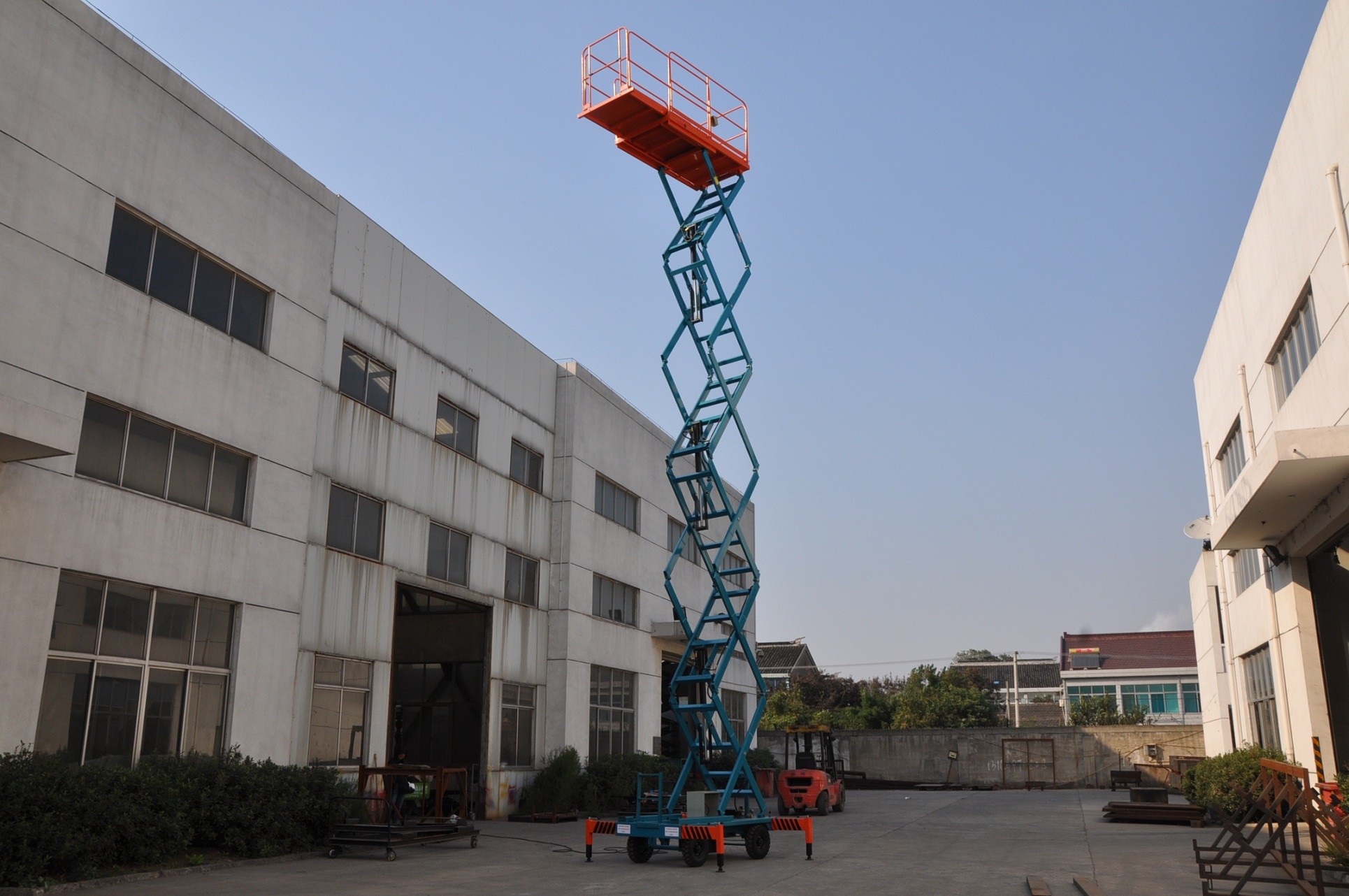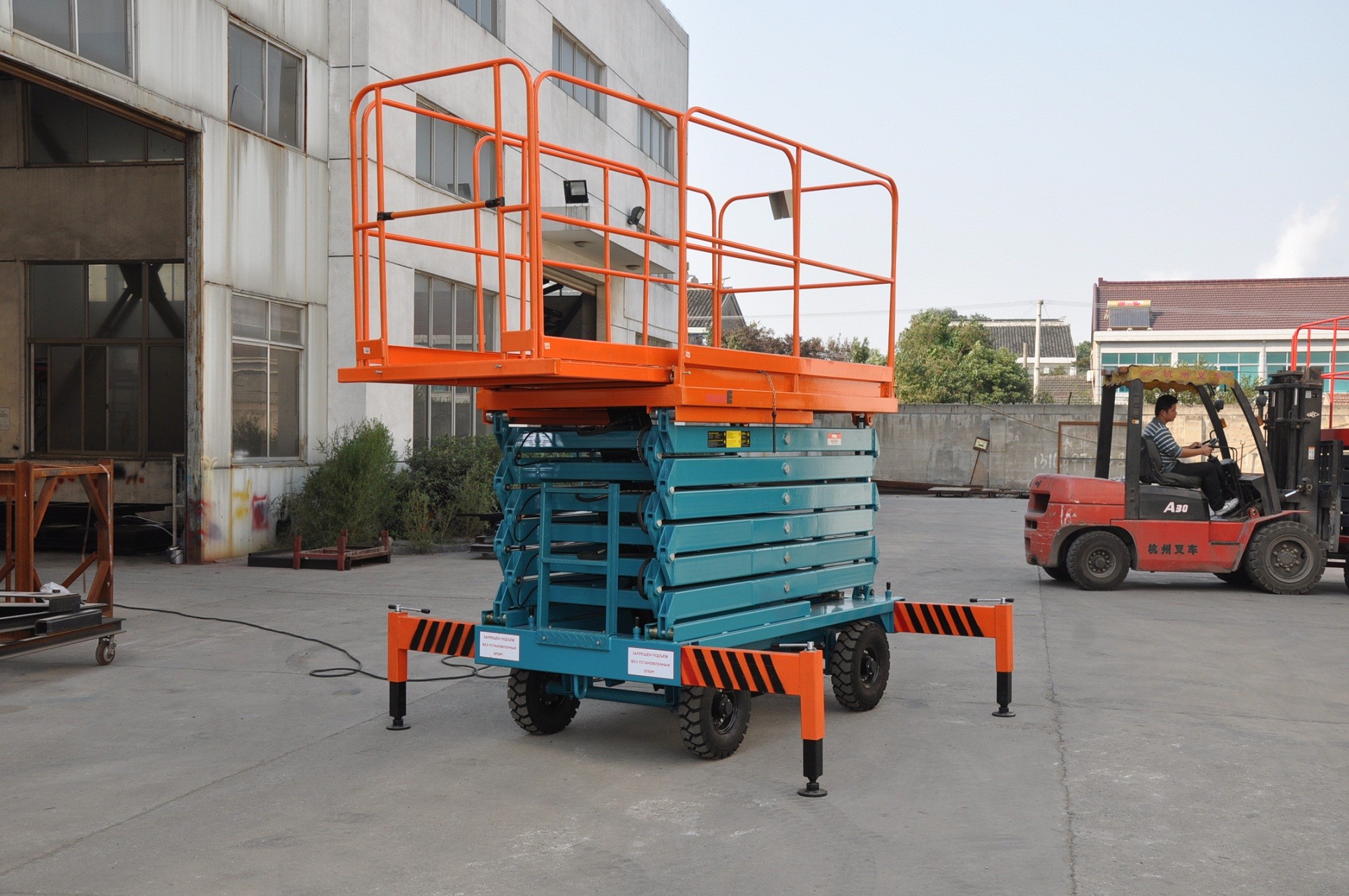 The major difference between mobile scissor lift with motorized wheel and standard scissor lift not of the handler is driven by electricity, but also the tyre. The mobile scissor lift with pulling device we manufacture has almost all the features the self-propelled one has except it needs to be moved by human not driven by the electricity totally.