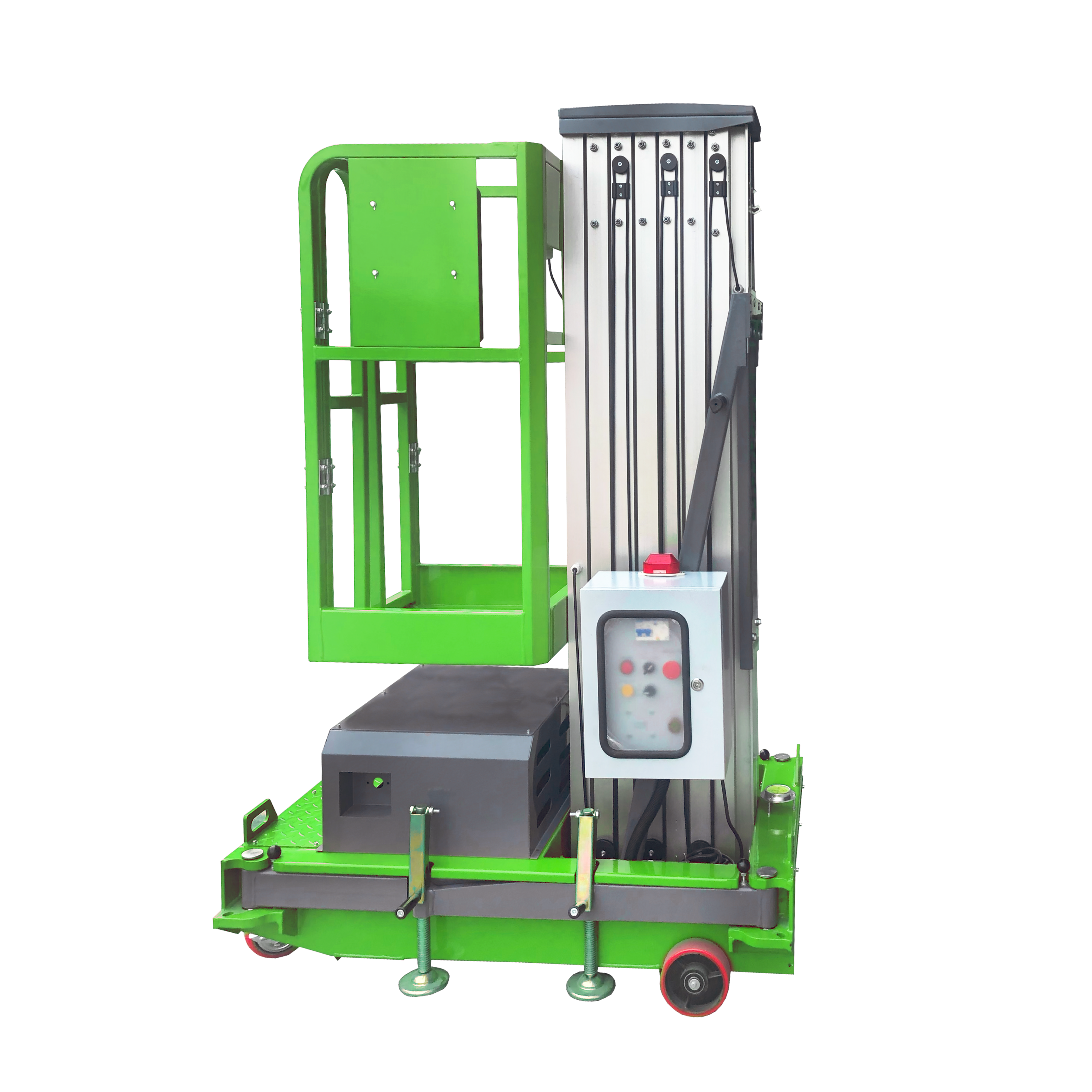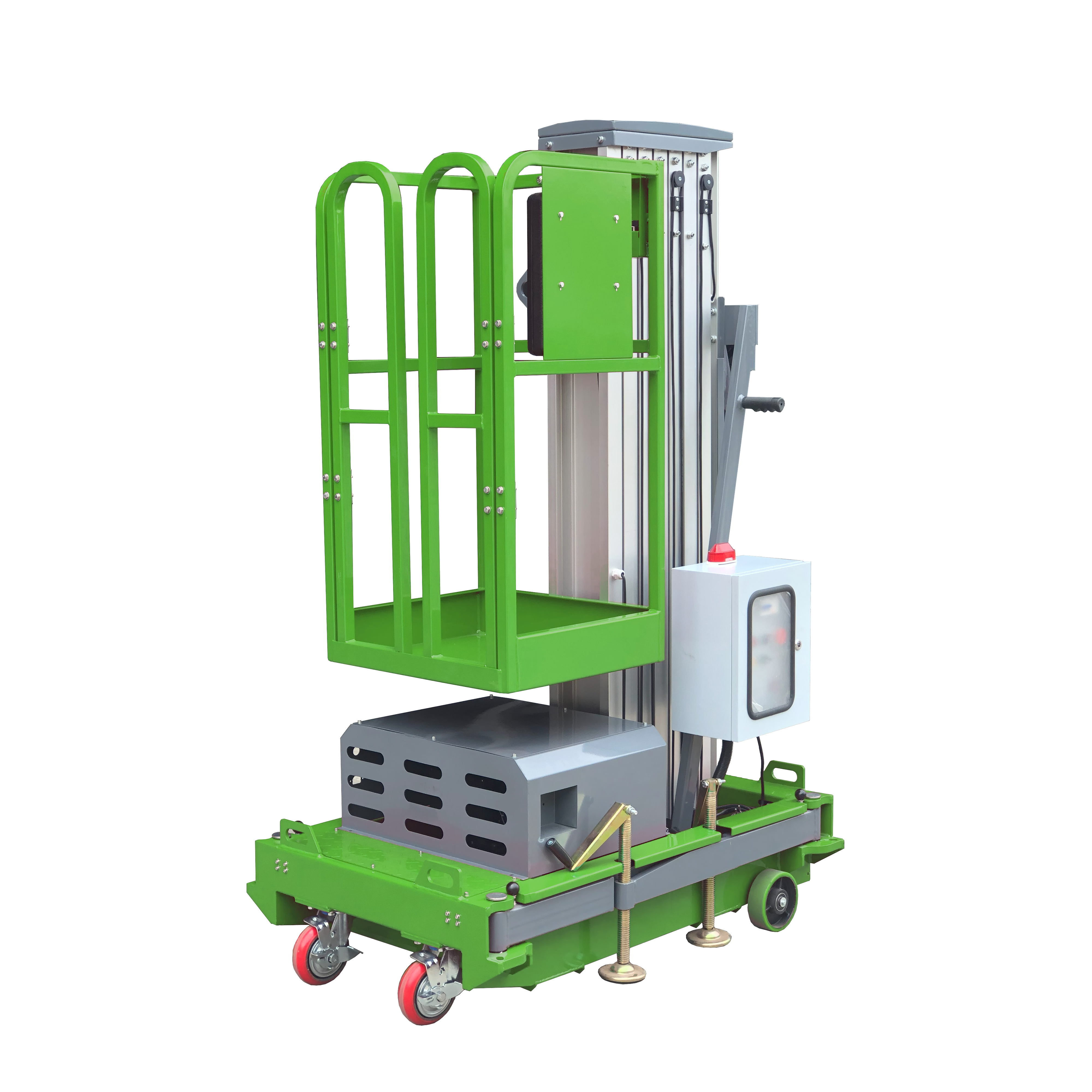 Features non-marking tires and anodized aluminum mast. Easily pushed around to the designated sites, beautiful structure, compact main body, light weighted, safe and reliable. It is operated by the telescopic cylinder which is strong and reliable working and the control panels are available on the lift platforms and ground.