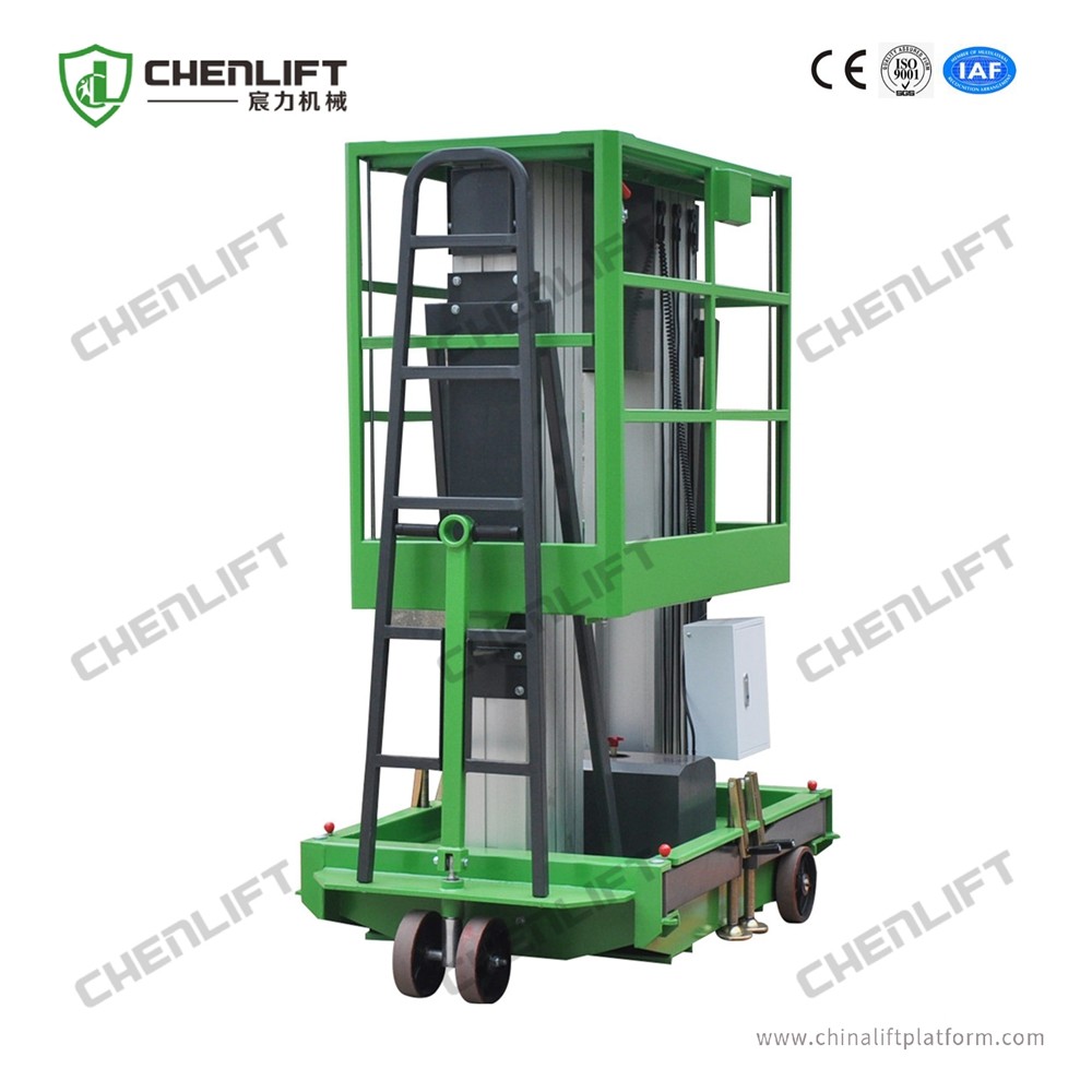 Features non-marking tires and anodized aluminum mast. Easily pushed around to the designated sites, beautiful structure, compact main body, light weighted, safe and reliable. It is operated by the telescopic cylinder which is strong and reliable working and the control panels are available on the lift platforms and ground.